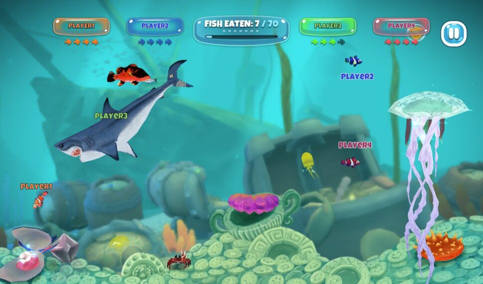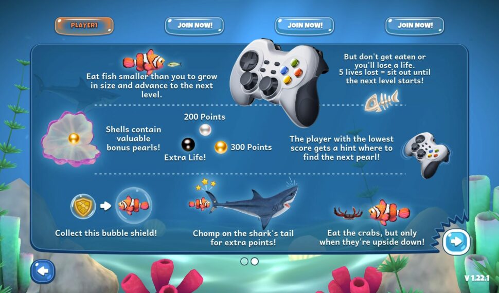 The shark can also be killed if you nibble at its tail several times, but careful for the shark can turn quickly. And be also aware of the lobster, crab, kraken, puffer fish, orca, and the electric eel. Each time you eat a fish or nibble on the shark´s tail, points are earned. When some shells on the bottom open, you have to be quick and collect the pearls inside. Each time you score, your fish will grow larger in size allowing you to eat even more of the fish on the screen.